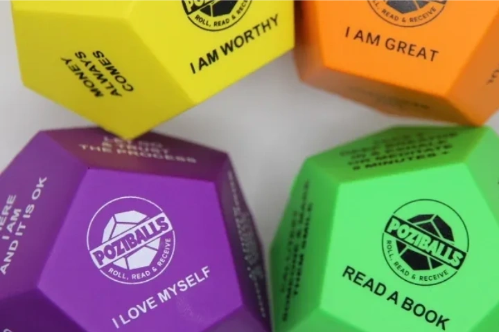 These colorful and all uniquely designed dodecahedron-shaped balls each hold 12 different powerful affirmations or action prompts designed to help uplift your mood, shift your mindset, and reconnect you to your joy — one roll at a time.